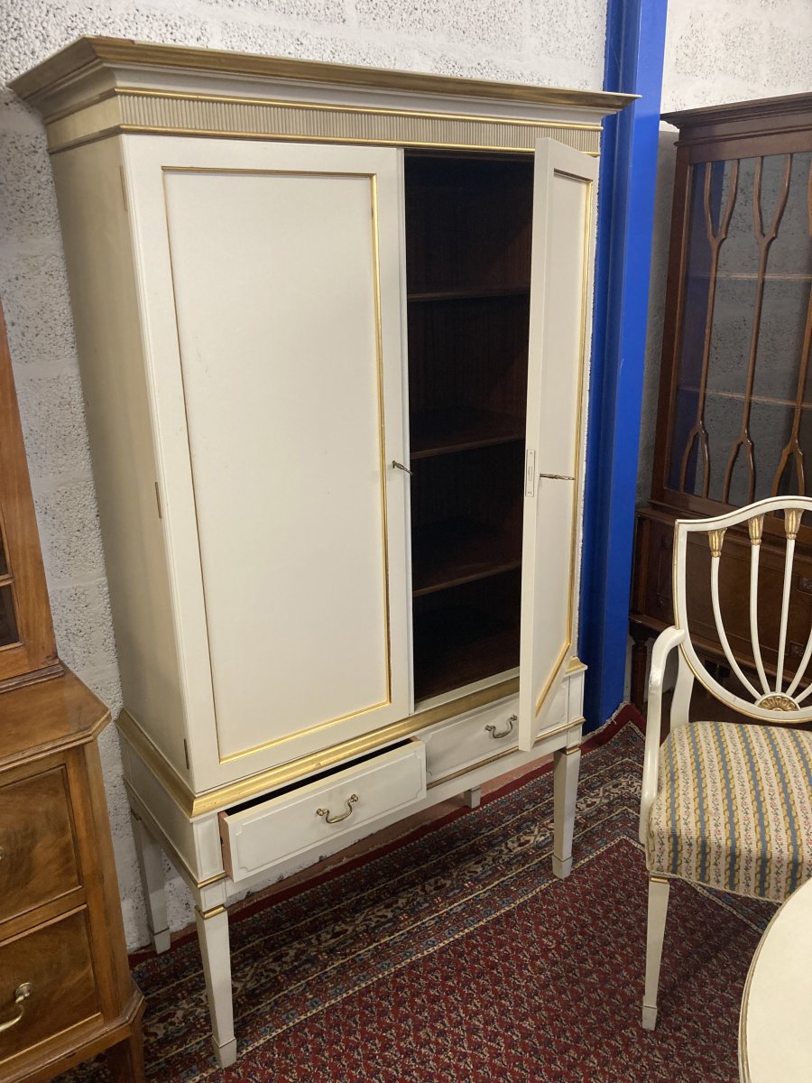 Front med to fyldnings låger bag hvilken hylder, herunder to skuffer, afslutter med tilspidsede firekantede ben.