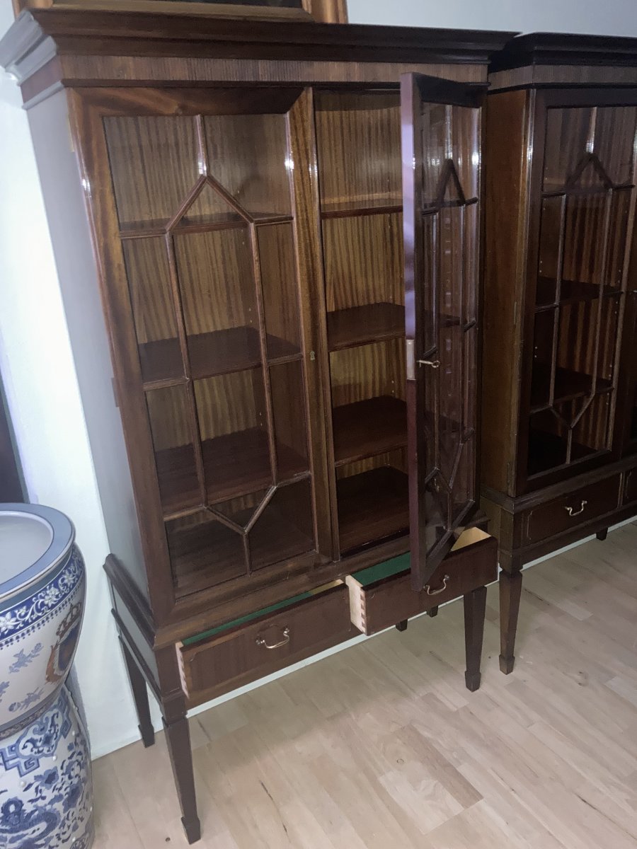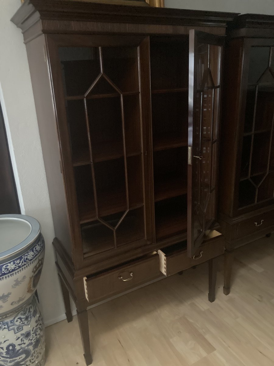 VitrineskabHepplewhite mahogni vitrineskab des. Strøjer Front med to glaslåger og lister herunder to skuffer ( haves to stykker )